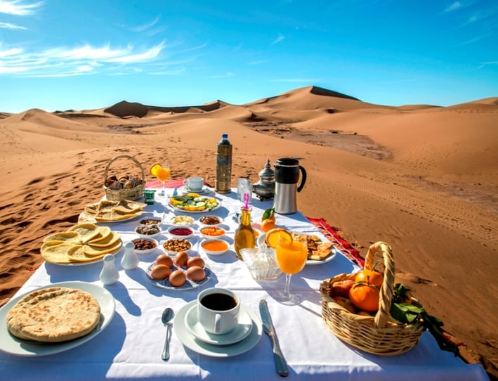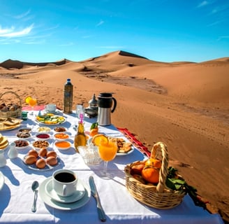 Begin your day with an exclusive breakfast set against the breathtaking backdrop of the golden dunes. Enjoy freshly prepared delicacies as the sun rises, painting the desert in warm, glowing hues.